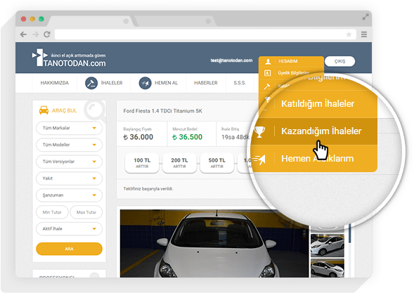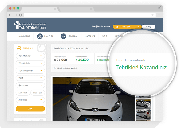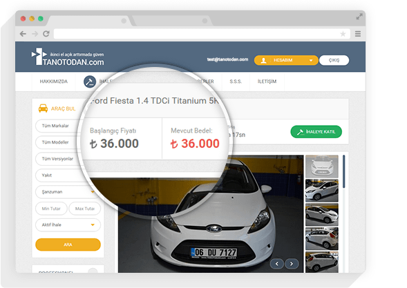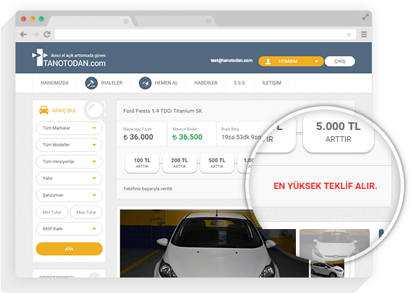 “İkinci El Açık Arttırmada Güven” sloganı ile yola başlayan Online İhale Sistemimiz, siz değerli müşterilerimize daha iyi hizmet sunmaktan ve güveninize layık olmaktan her zaman gurur duyacaktır. Her türlü sorun ve sorularınız için satış danışmanı arkadaşlarımızla ve tanotodan@tanoto.com.tr e-posta adresimiz üzerinden bizlere ulaşabilirsiniz.